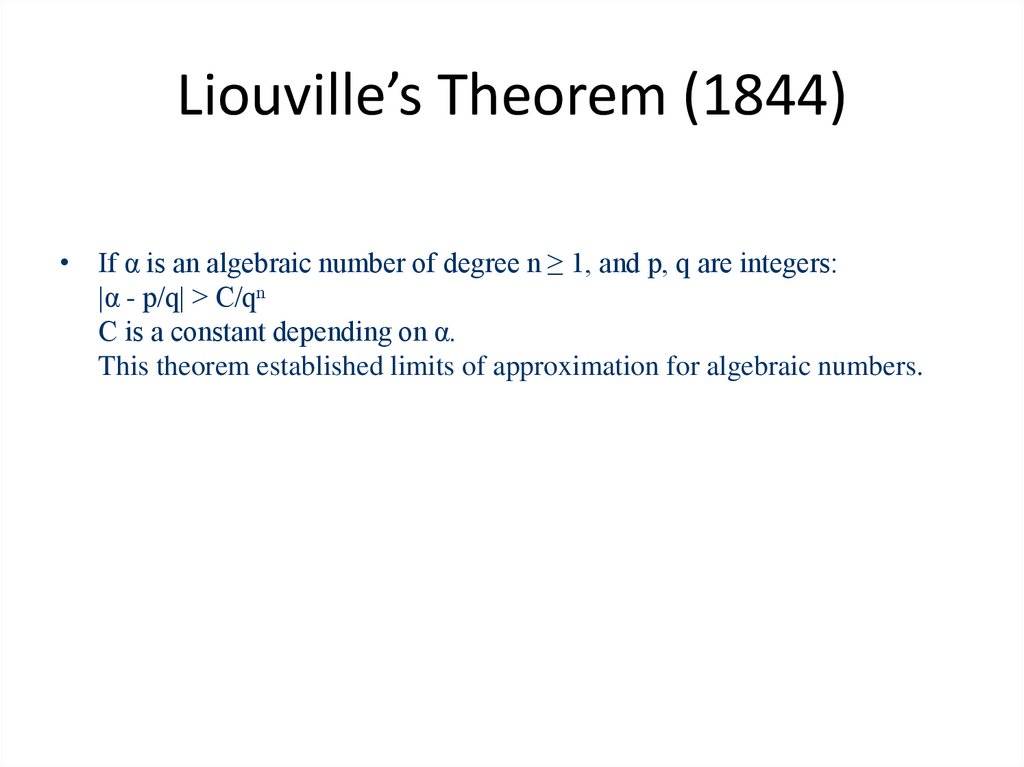 Liouville’s Theorem (1844)• If α is an algebraic number of degree n ≥ 1, and p, q are integers: