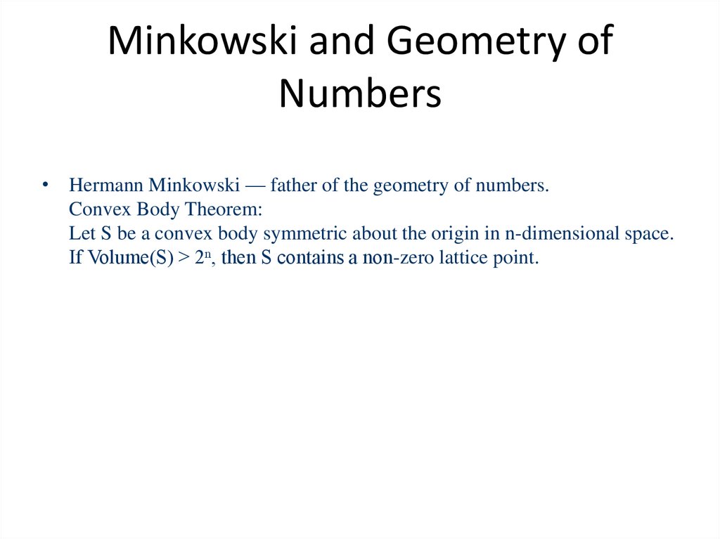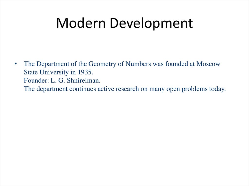 Modern Development• The Department of the Geometry of Numbers was founded at Moscow