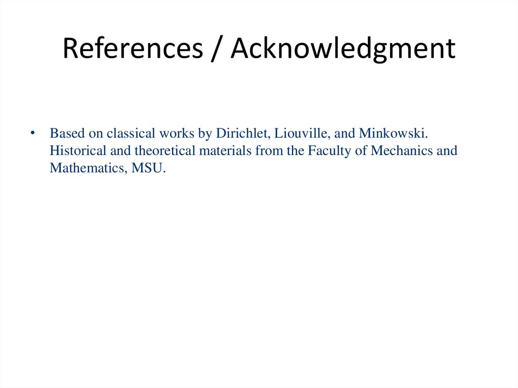 References / Acknowledgment• Based on classical works by Dirichlet, Liouville, and Minkowski.