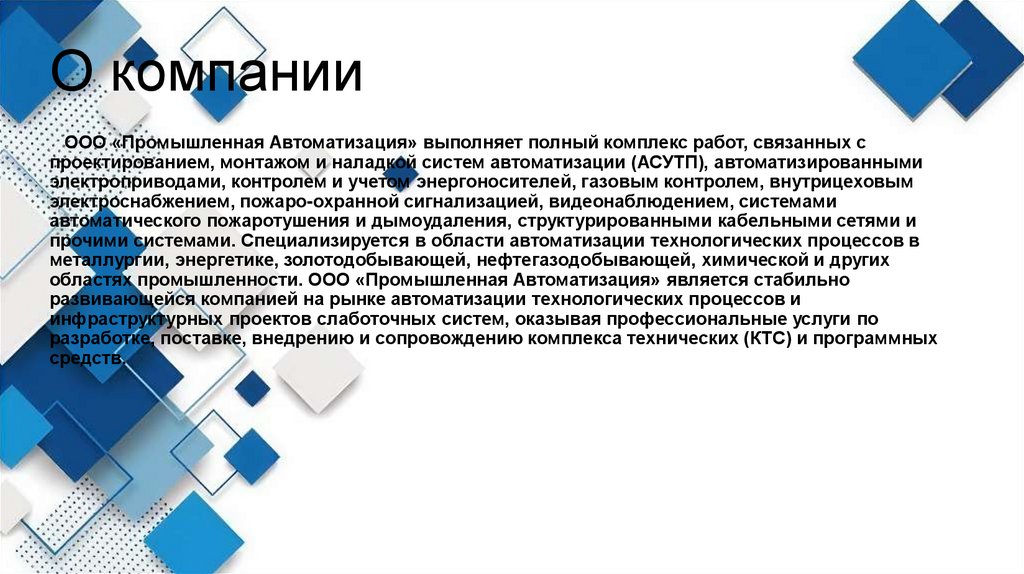 О компанииООО «Промышленная Автоматизация» выполняет полный комплекс работ, связанных с