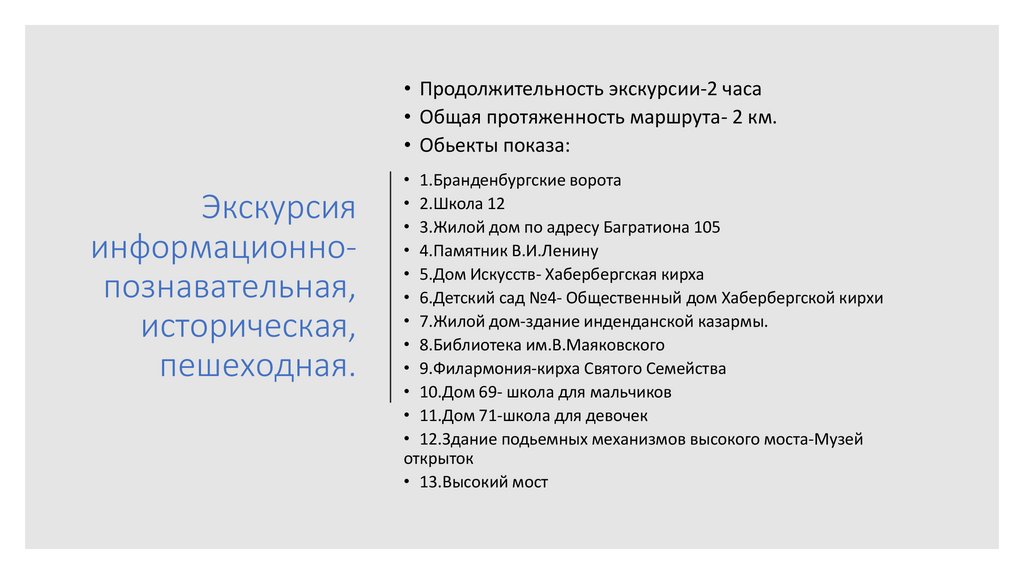 1. Экскурсия информационно-познавательная, историческая, пешеходная.