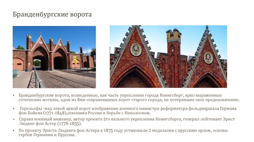 Бранденбургские ворота• Бранденбургские ворота, возведенные, как часть укрепления города Кенигсберг, ярко выраженные