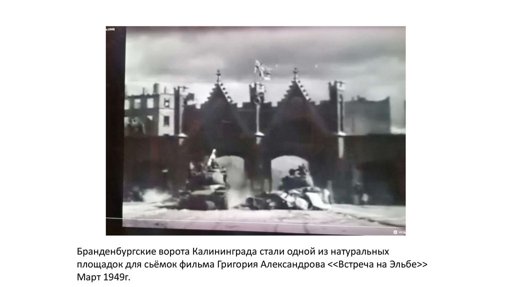 Бранденбургские ворота Калининграда стали одной из натуральныхплощадок для сьёмок фильма Григория Александрова <<Встреча на Эльбе>>