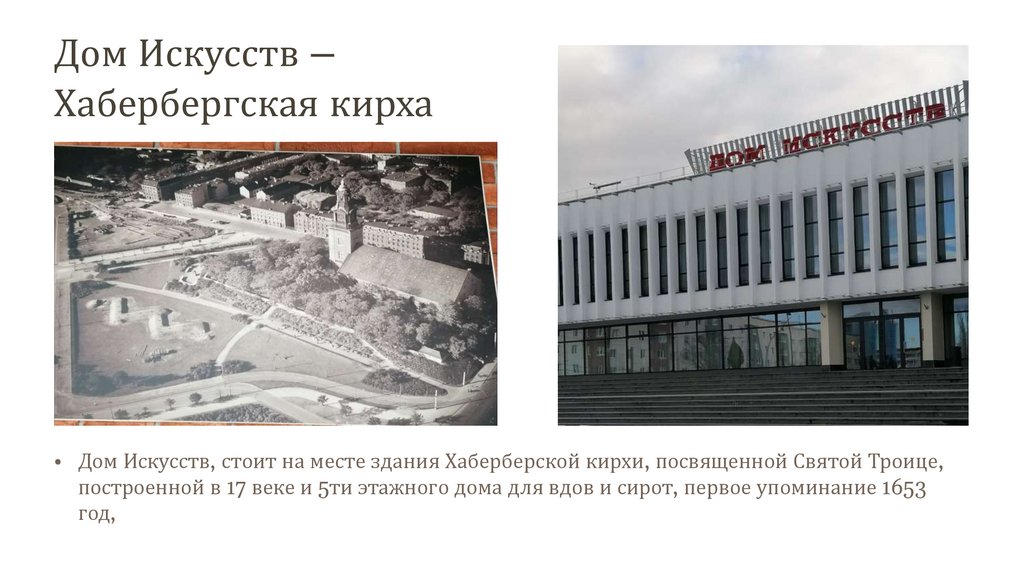 • Дом Искусств, стоит на месте здания Хаберберской кирхи, посвященной Святой Троице,