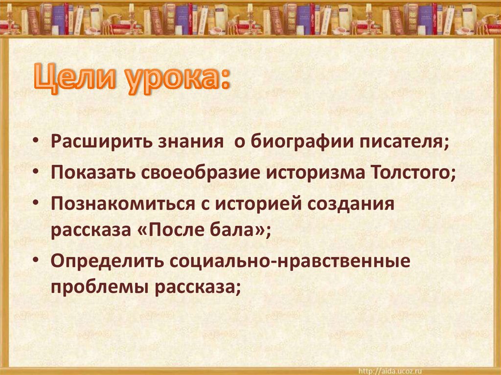 • Расширить знания о биографии писателя;• Показать своеобразие историзма Толстого;