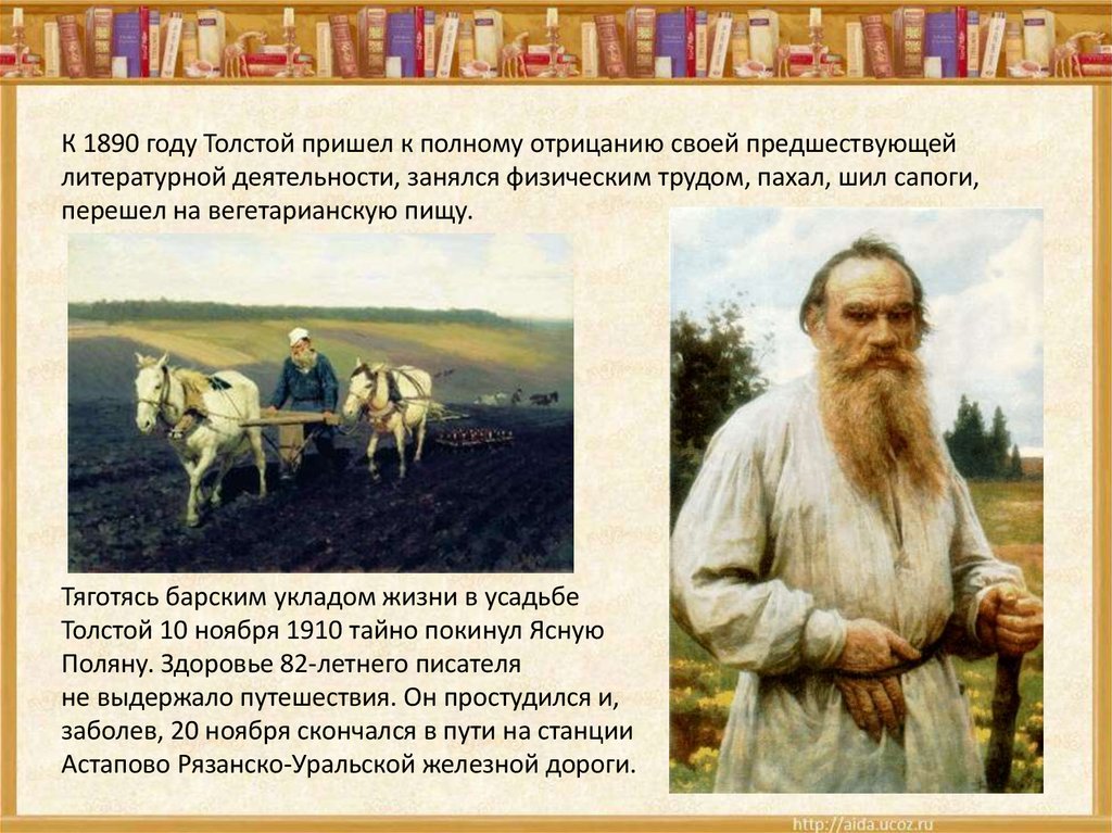 К 1890 году Толстой пришел к полному отрицанию своей предшествующейлитературной деятельности, занялся физическим трудом, пахал, шил сапоги,