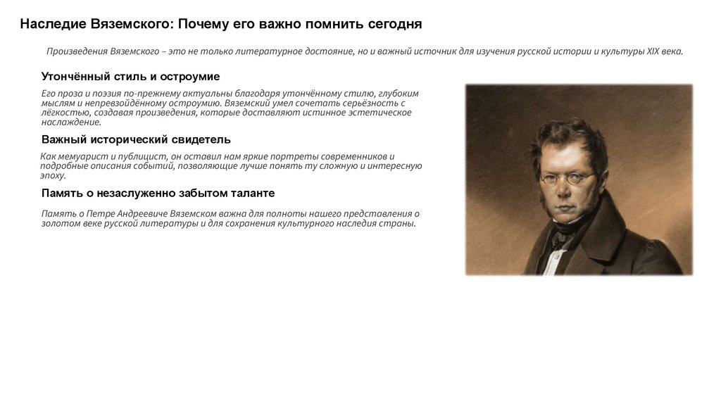 Наследие Вяземского: Почему его важно помнить сегодняПроизведения Вяземского – это не только литературное достояние, но и важный источник для изучения русской истории и культуры XIX века.