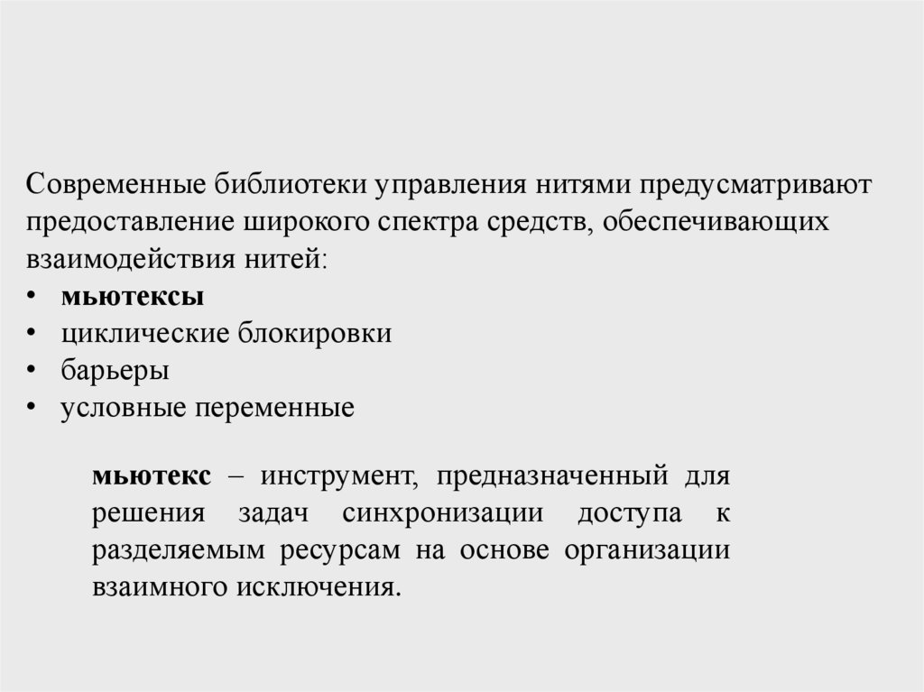 Современные библиотеки управления нитями предусматриваютпредоставление широкого спектра средств, обеспечивающих