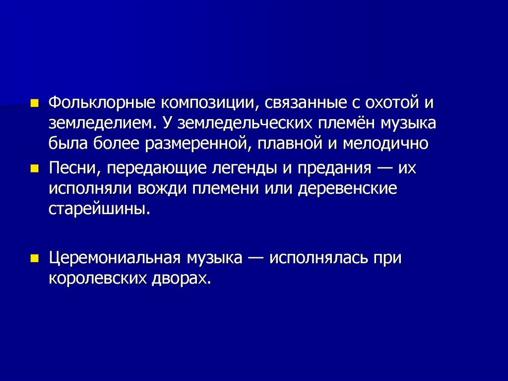 Фольклорные композиции, связанные с охотой иземледелием. У земледельческих племён музыка