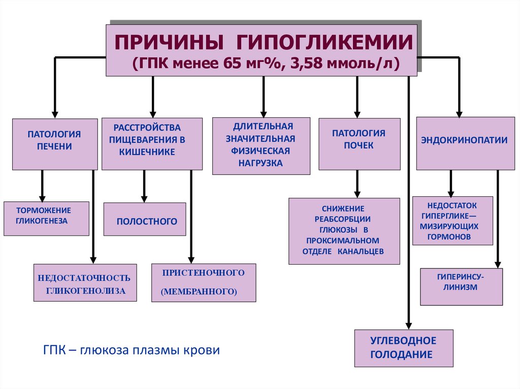 ПРИЧИНЫ ГИПОГЛИКЕМИИ(ГПК менее 65 мг%, 3,58 ммоль/л)