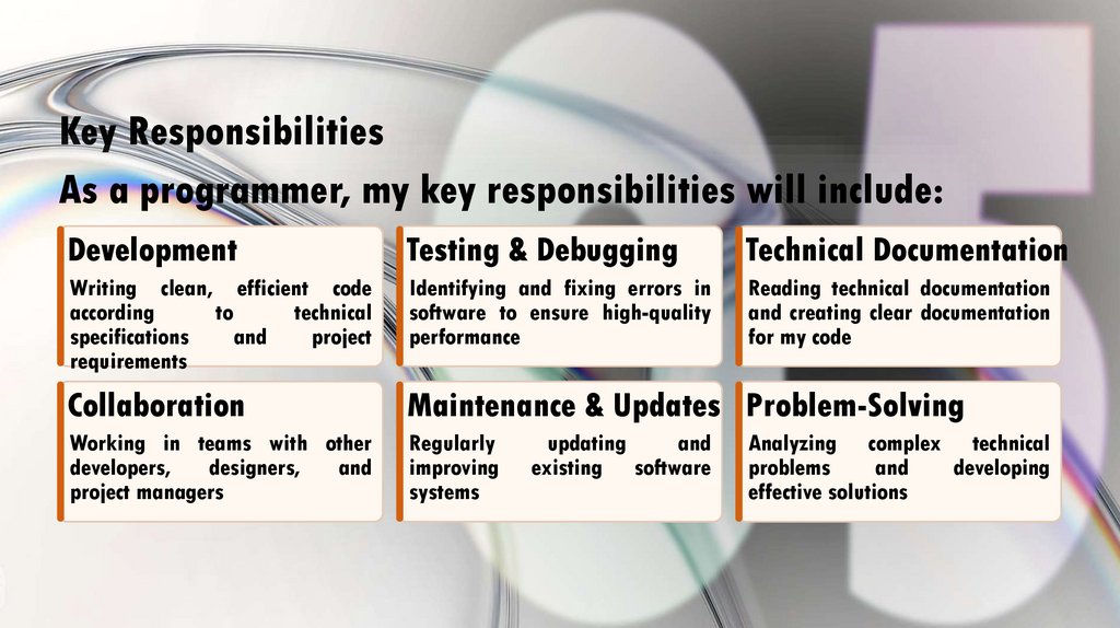 Key ResponsibilitiesAs a programmer, my key responsibilities will include: