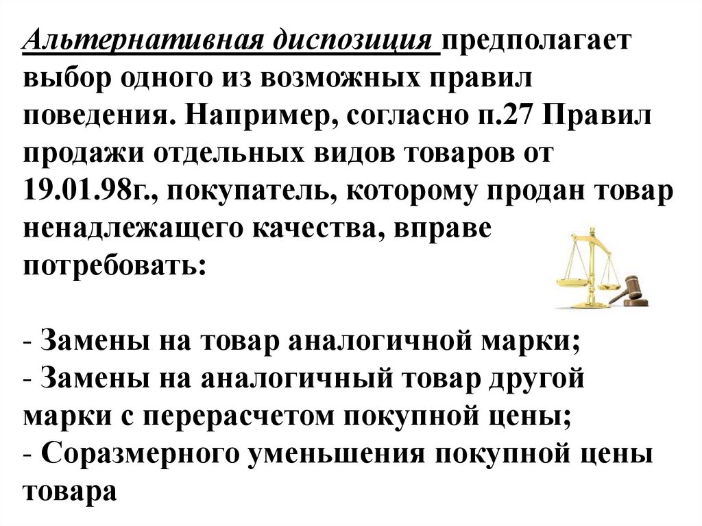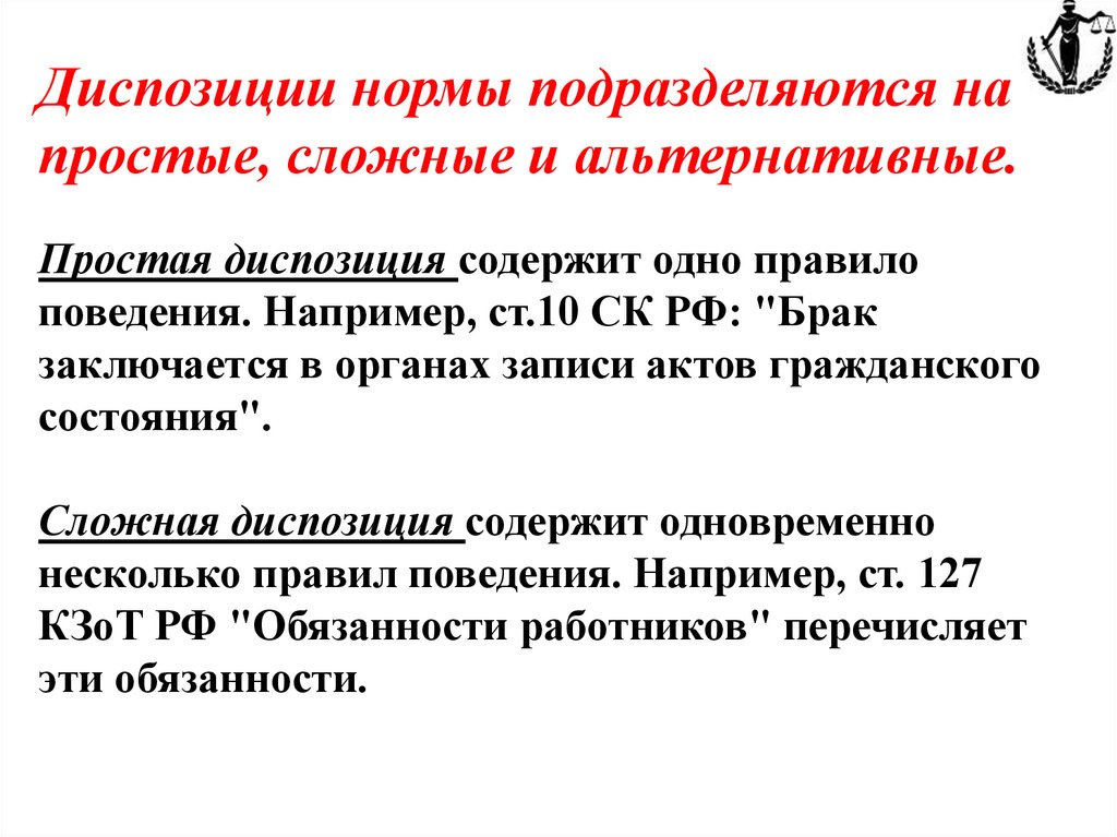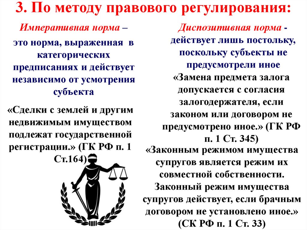 3. По методу правового регулирования:Диспозитивная норма действует лишь постольку,
