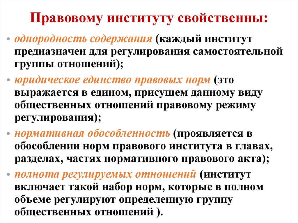 Правовому институту свойственны:• однородность содержания (каждый институт