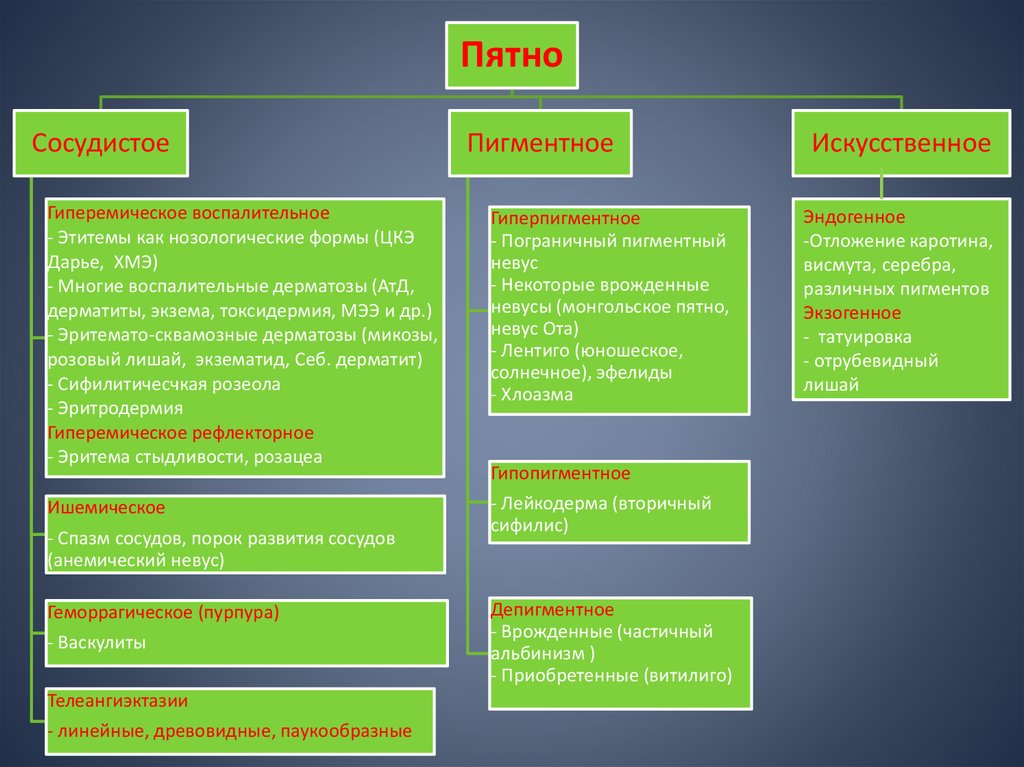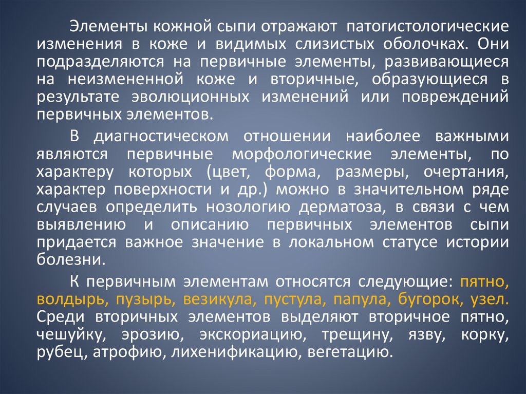 1. Элементы сыпи (первичные ивторичные) – цвет, консистенция, температура,