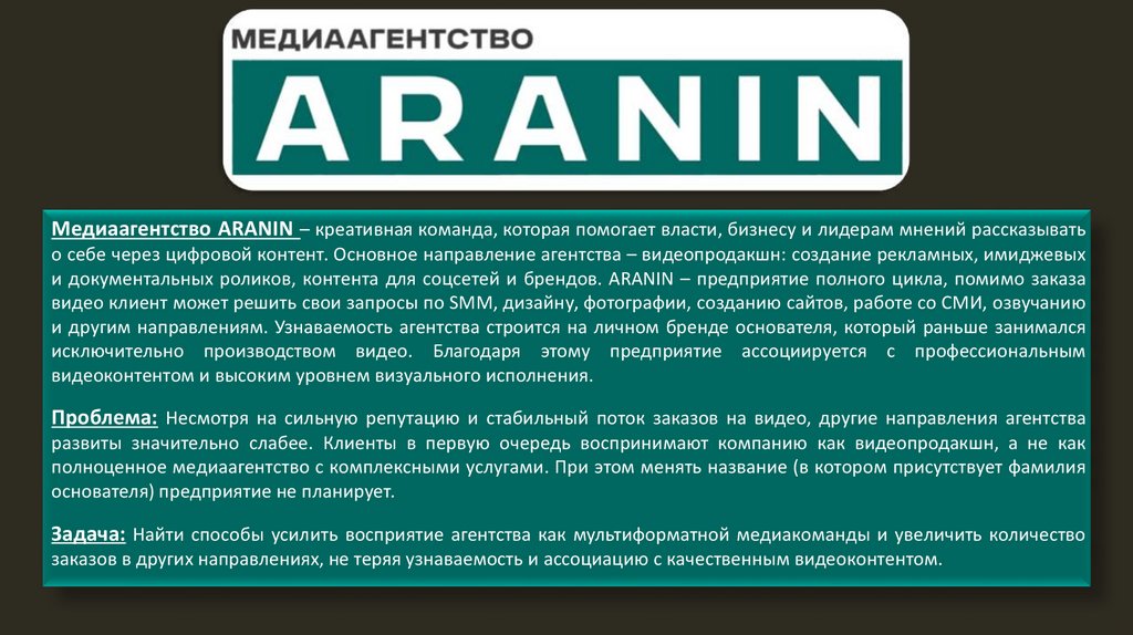 Медиаагентство ARANIN – креативная команда, которая помогает власти, бизнесу и лидерам мнений рассказыватьо себе через цифровой контент. Основное направление агентства – видеопродакшн: создание рекламных, имиджевых