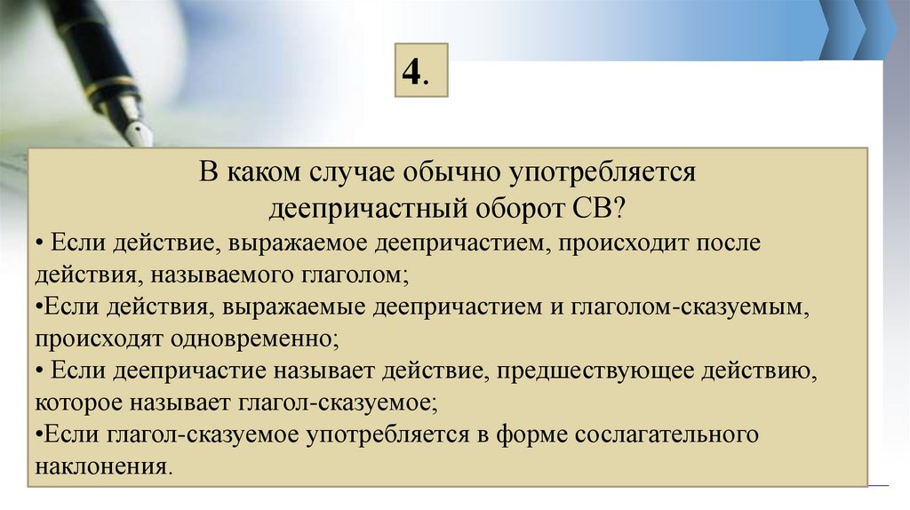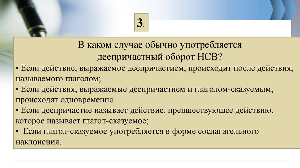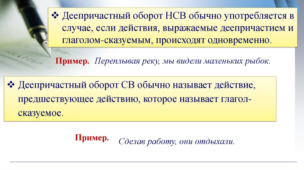 Деепричастный оборот НСВ обычно употребляется вслучае, если действия, выражаемые деепричастием и