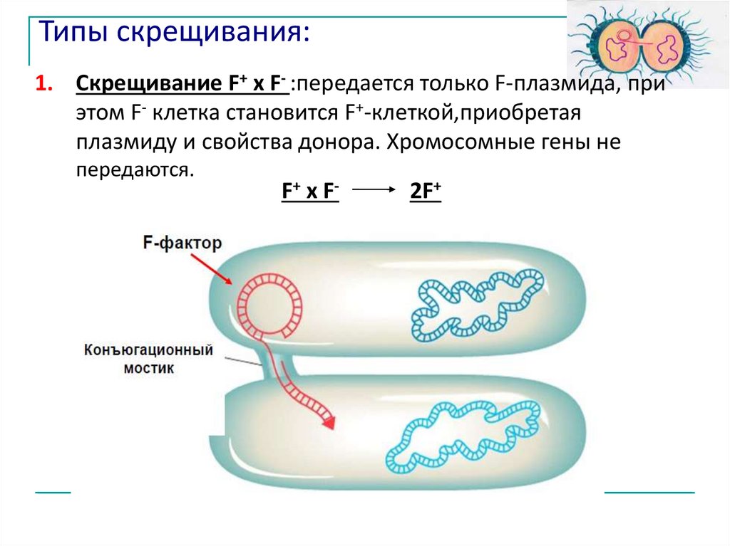 Типы скрещивания:1. Скрещивание F+ x F- :передается только F-плазмида, при