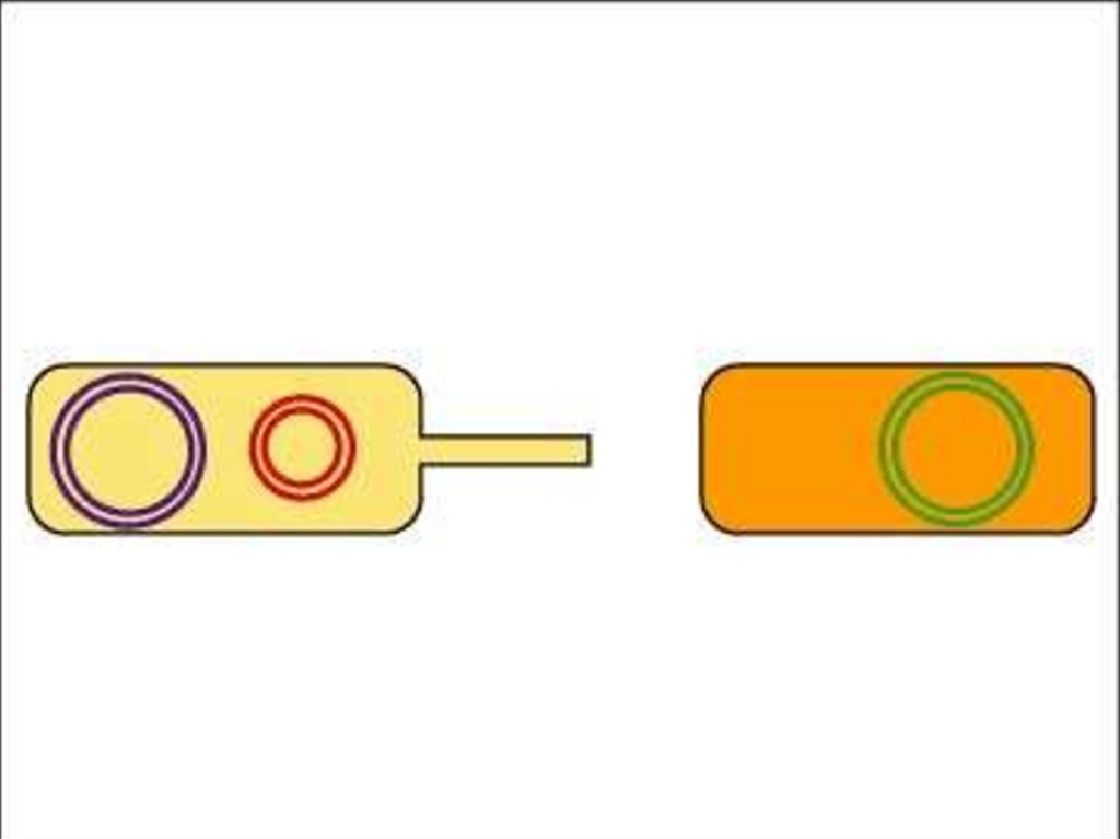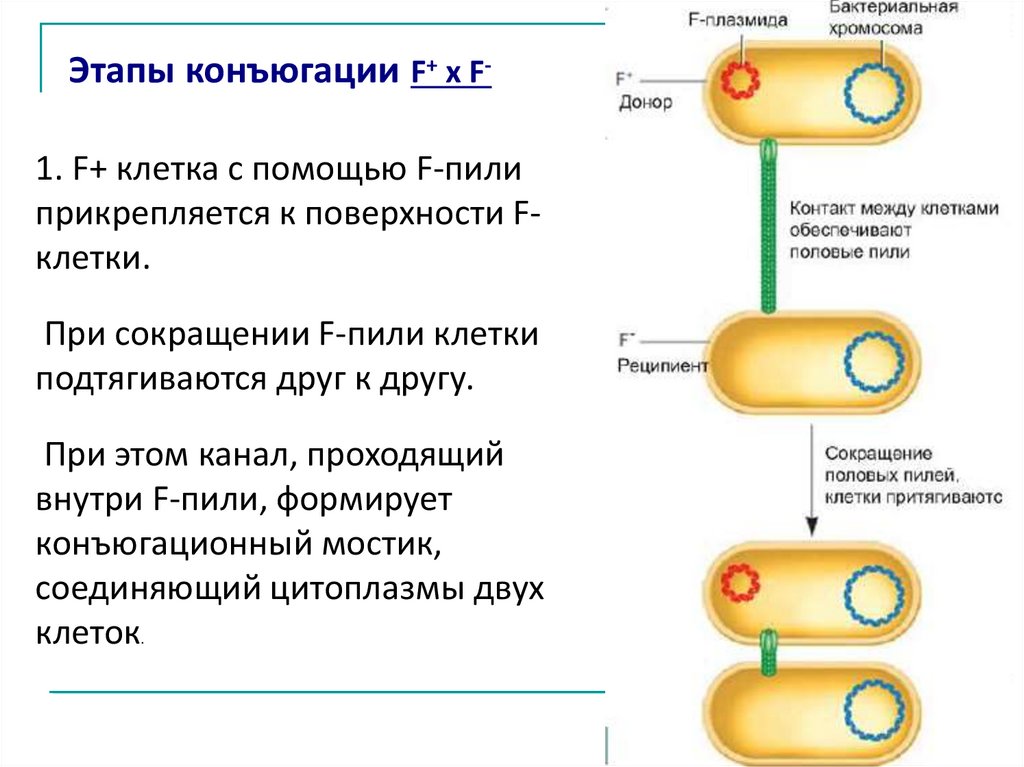 Этапы конъюгации F+ x F1. F+ клетка с помощью F-пилиприкрепляется к поверхности Fклетки.