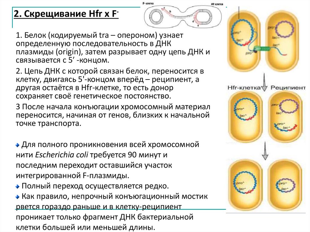 2. Скрещивание Hfr x F1. Белок (кодируемый tra – опероном) узнаетопределенную последовательность в ДНК