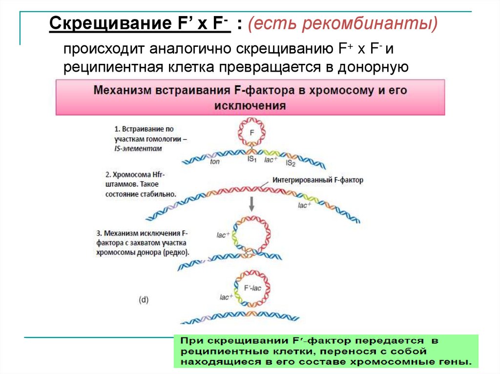 Скрещивание F’ x F- : (есть рекомбинанты)происходит аналогично скрещиванию F+ x F- и