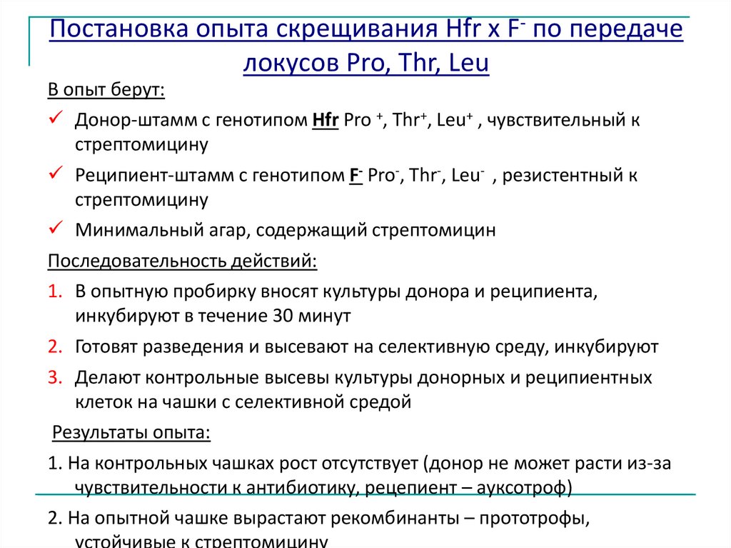 Постановка опыта скрещивания Hfr x F- по передачелокусов Pro, Thr, Leu