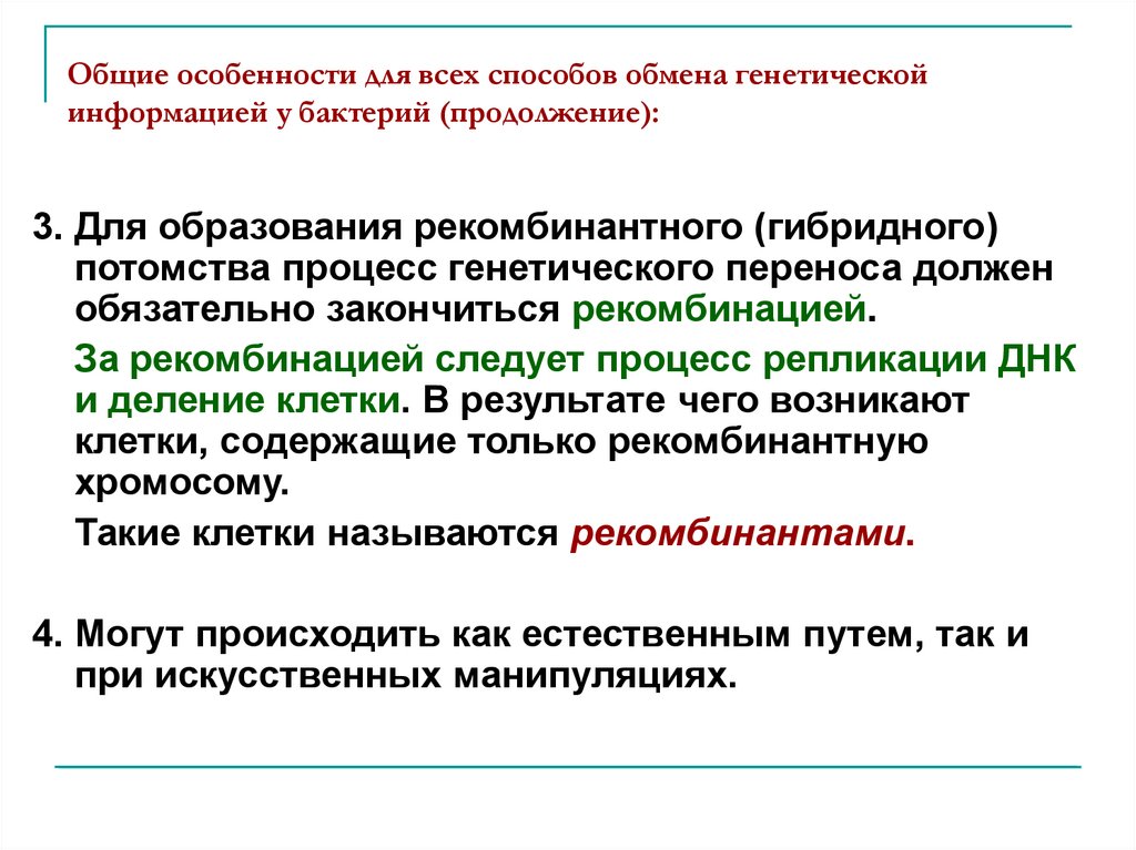 Общие особенности для всех способов обмена генетическойинформацией у бактерий (продолжение):