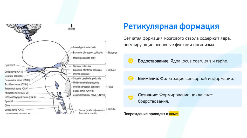 Ретикулярная формацияСетчатая формация мозгового ствола содержит ядра,
