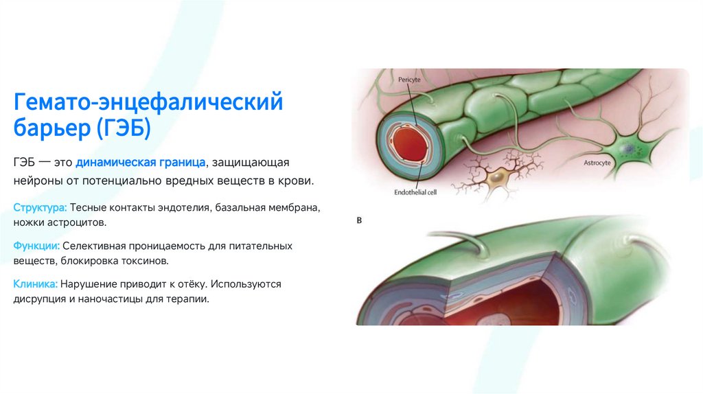 Структура: Тесные контакты эндотелия, базальная мембрана,