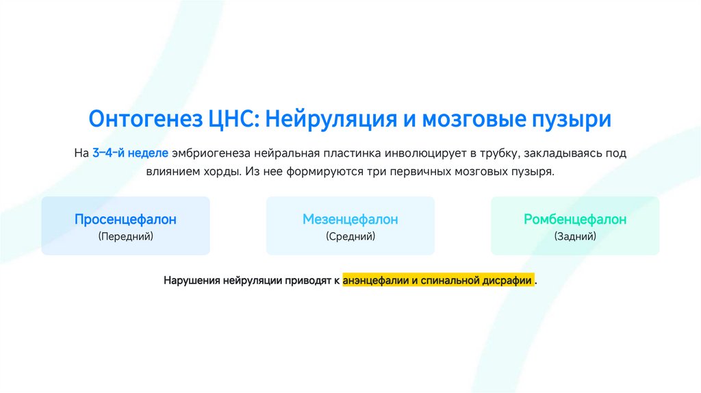 Онтогенез ЦНС: Нейруляция и мозговые пузыриНа 3–4-й неделе эмбриогенеза нейральная пластинка инволюцирует в трубку, закладываясь под