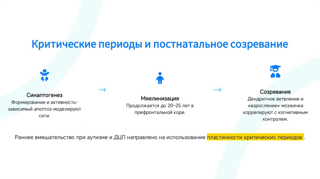 Раннее вмешательство при аутизме и ДЦП направлено на использование пластичности критических периодов .