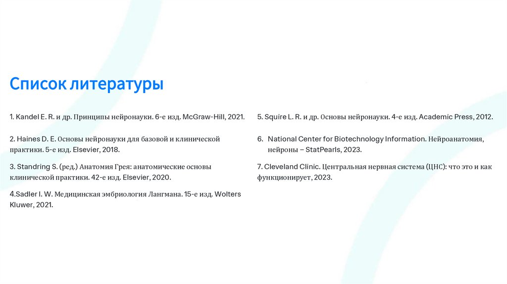 Список литературы1. Kandel E. R. и др. Принципы нейронауки. 6-е изд. McGraw-Hill, 2021.