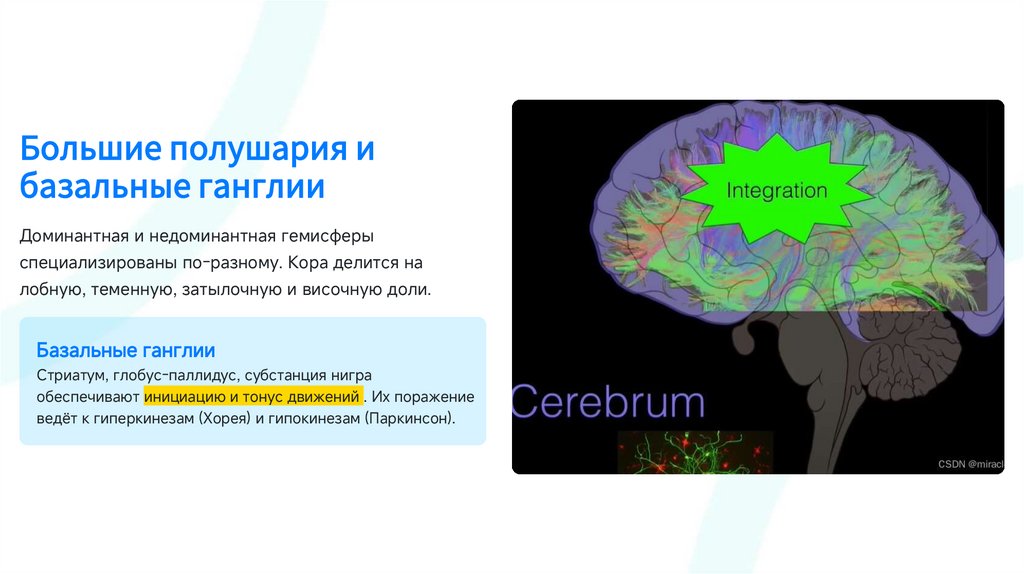 ведёт к гиперкинезам (Хорея) и гипокинезам (Паркинсон).