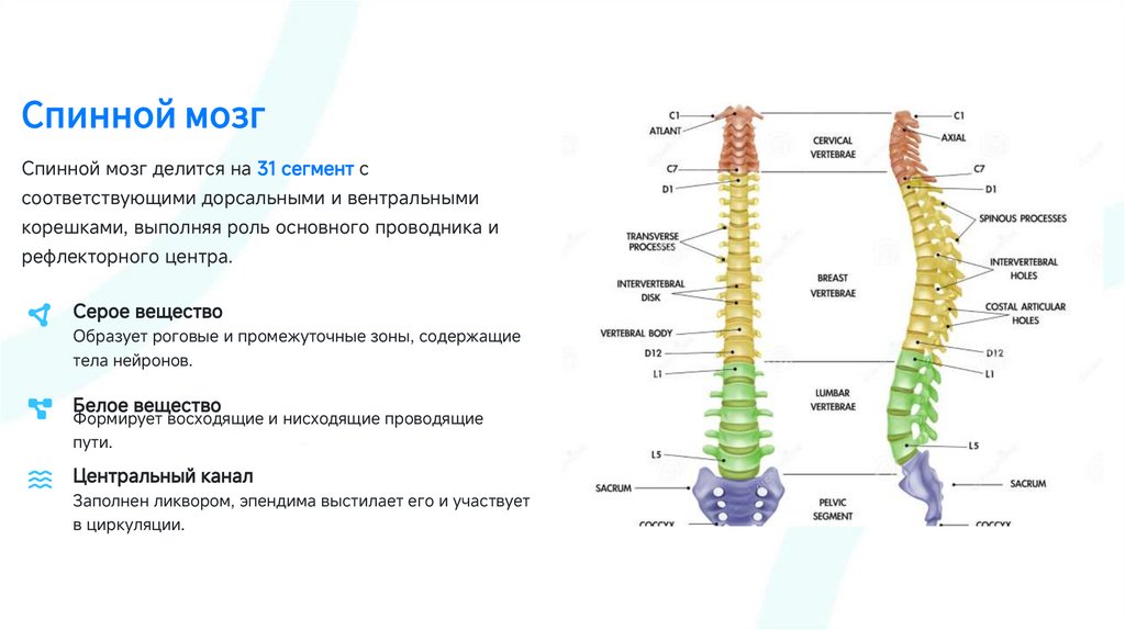Спинной мозгСпинной мозг делится на 31 сегмент с