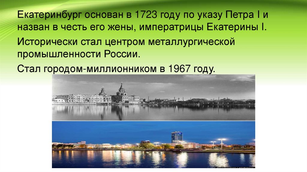 Екатеринбург основан в 1723 году по указу Петра I иназван в честь его жены, императрицы Екатерины I.