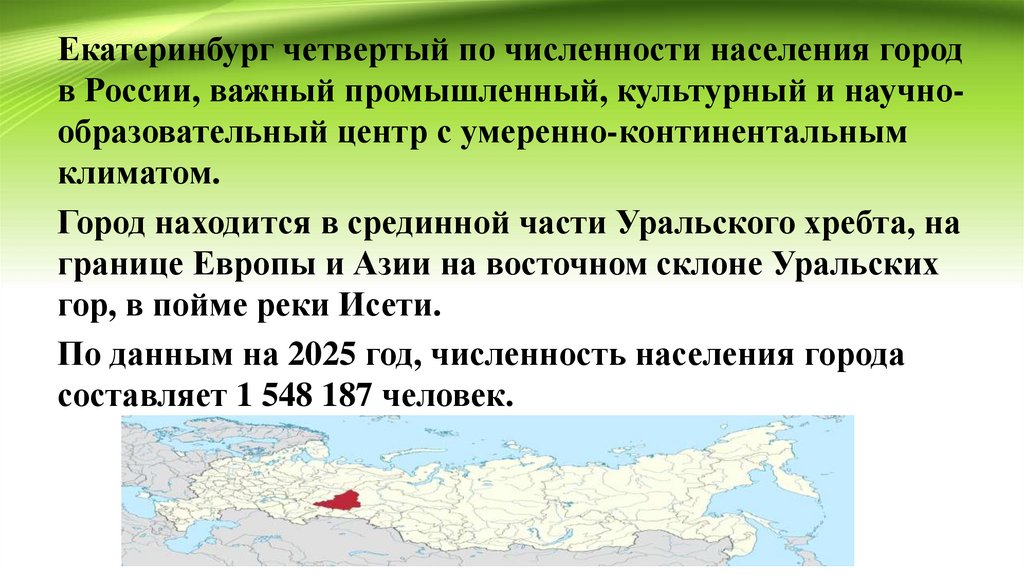 Екатеринбург четвертый по численности населения городв России, важный промышленный, культурный и научнообразовательный центр с умеренно-континентальным