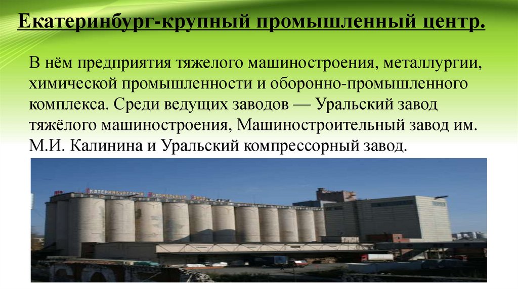 Екатеринбург-крупный промышленный центр.В нём предприятия тяжелого машиностроения, металлургии,