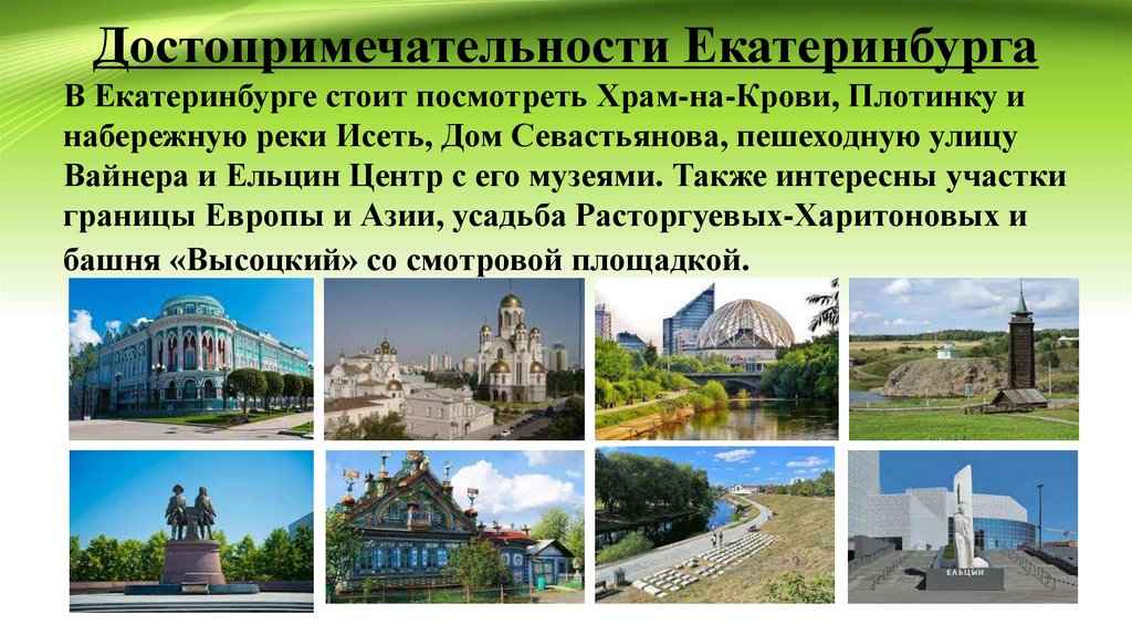 Достопримечательности ЕкатеринбургаВ Екатеринбурге стоит посмотреть Храм-на-Крови, Плотинку и
