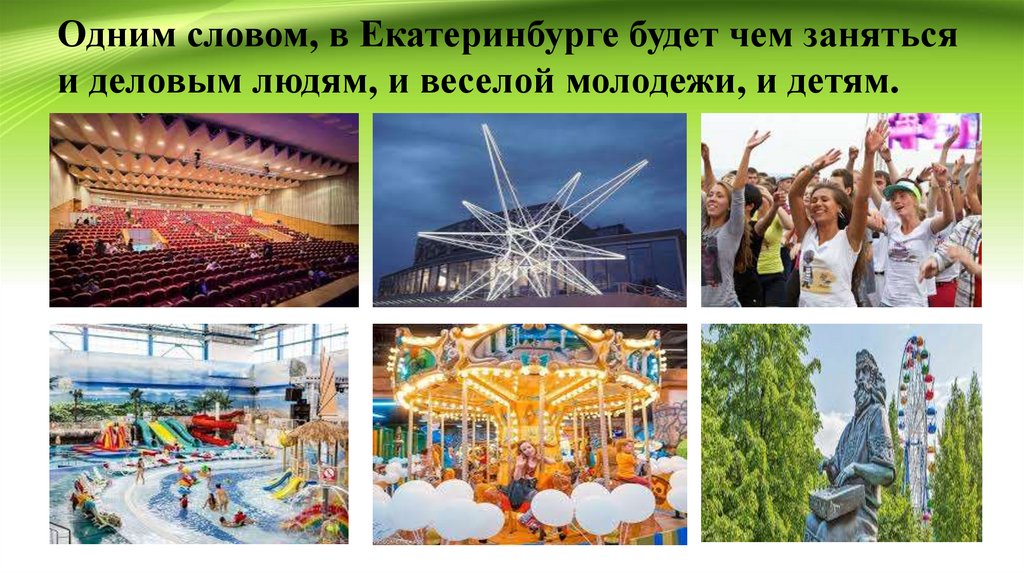 Одним словом, в Екатеринбурге будет чем занятьсяи деловым людям, и веселой молодежи, и детям.