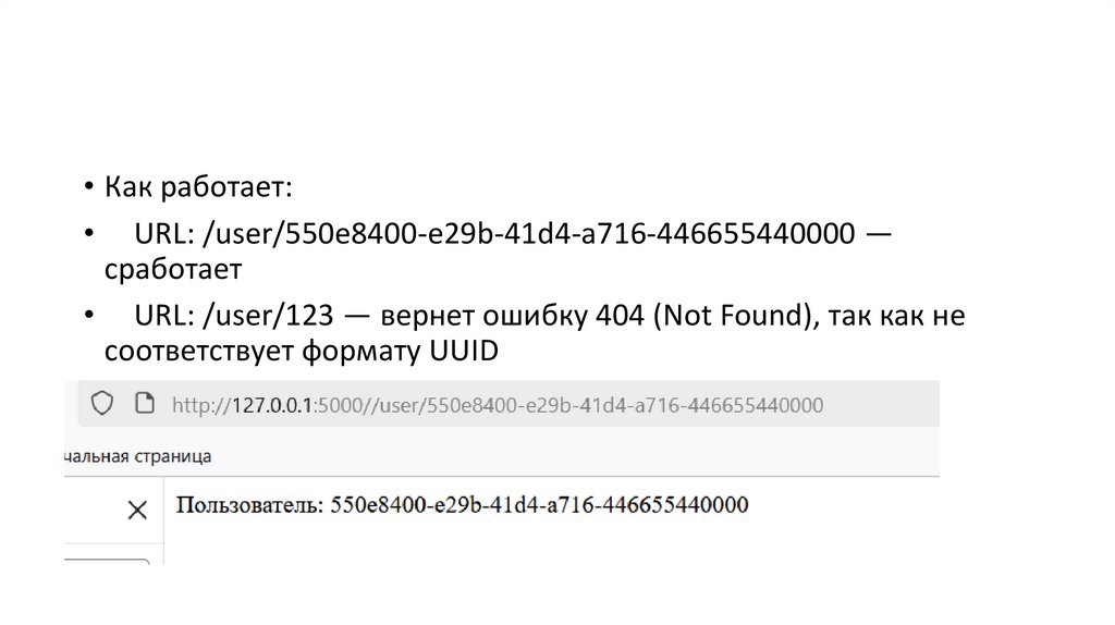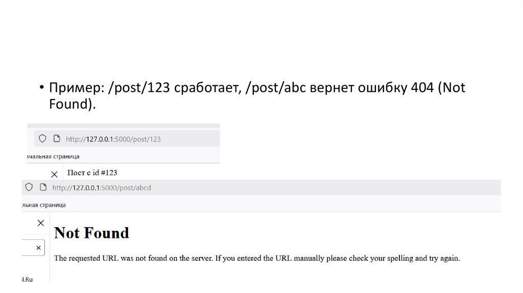 • Пример: /post/123 сработает, /post/abc вернет ошибку 404 (NotFound).