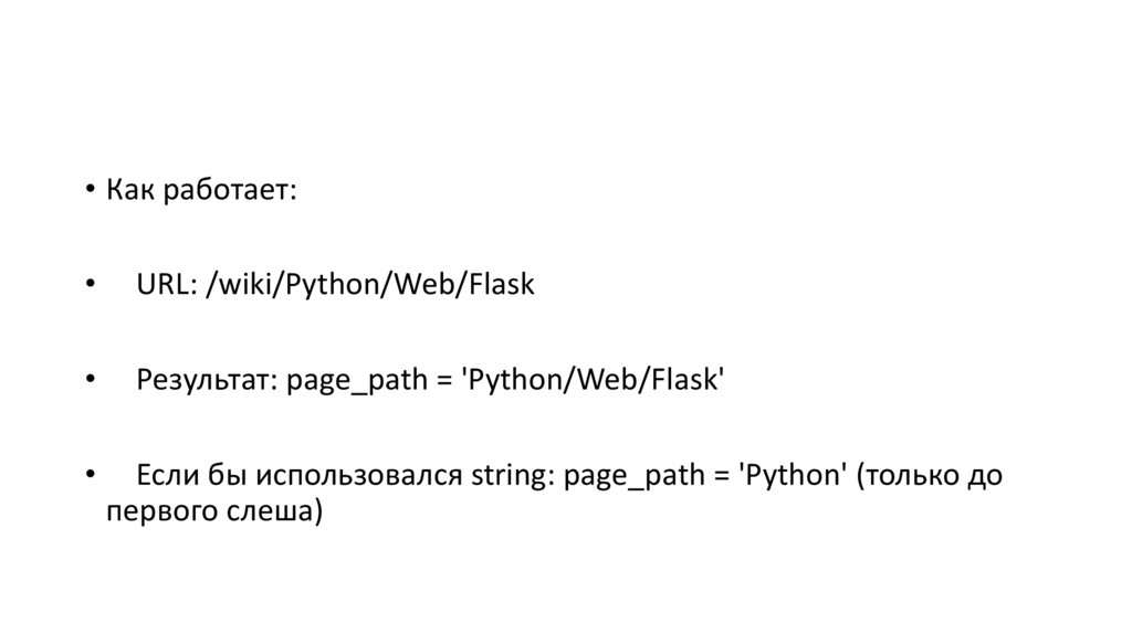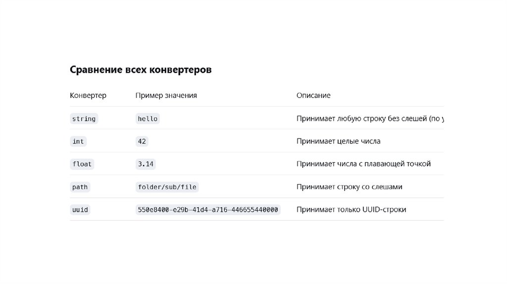 • Конвертер path похож на стандартный string, но с одним ключевым отличием: он неигнорирует слеши (/). Обычный строковый конвертер останавливается на первом
