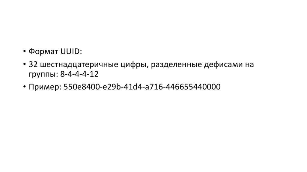 • Формат UUID:• 32 шестнадцатеричные цифры, разделенные дефисами на