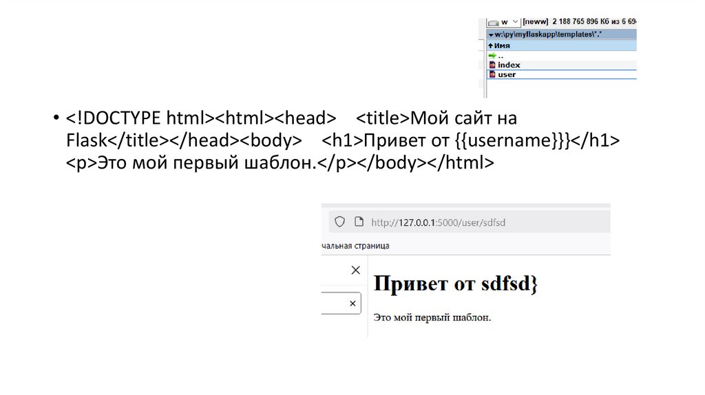 • <!DOCTYPE html><html><head> <title>Мой сайт наFlask</title></head><body> <h1>Привет от {{username}}}</h1>