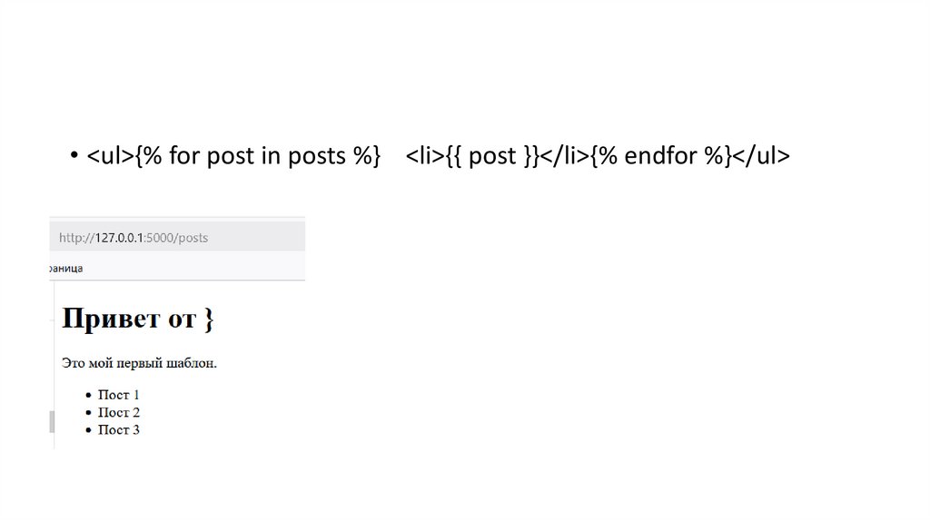 • Пример цикла (передача списка из Python):@app.route('/posts')def posts():