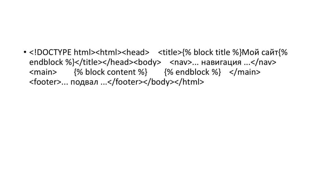 • <!DOCTYPE html><html><head> <title>{% block title %}Мой сайт{%endblock %}</title></head><body> <nav>... навигация ...</nav>