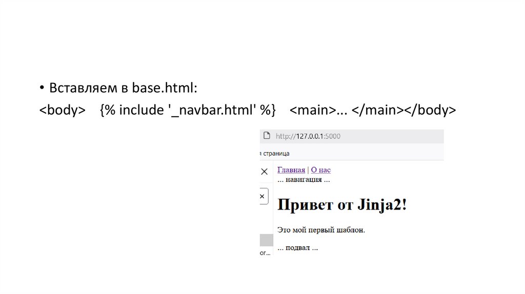 • Вставляем в base.html:<body> {% include '_navbar.html' %} <main>... </main></body>
