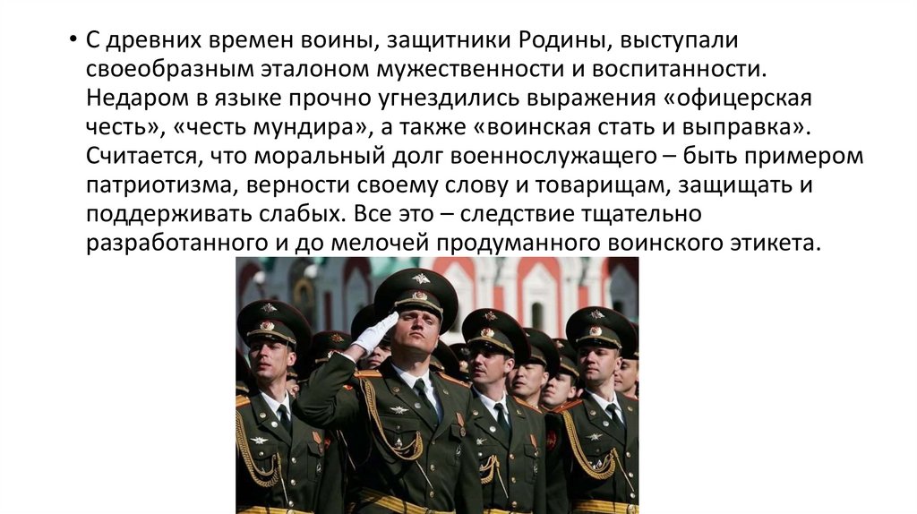 • С древних времен воины, защитники Родины, выступалисвоеобразным эталоном мужественности и воспитанности.