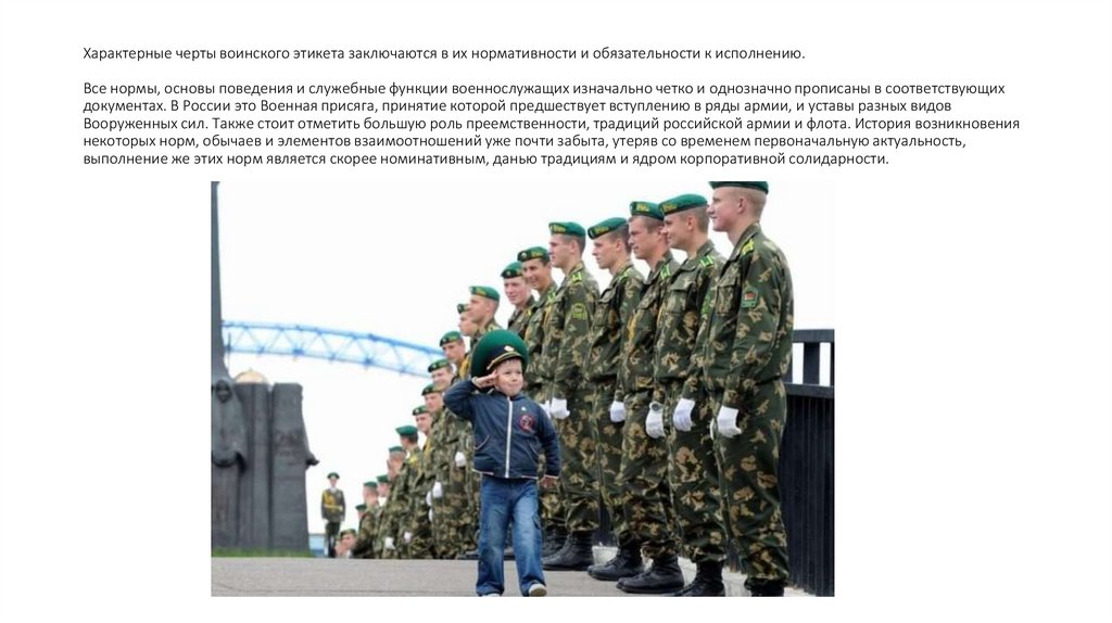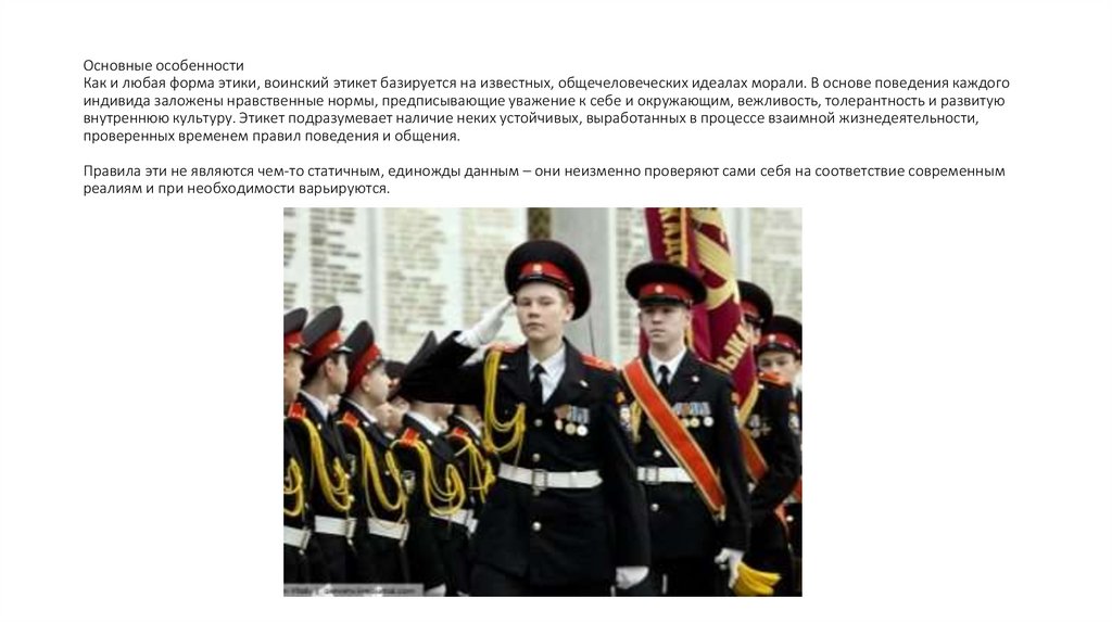 Основные особенностиКак и любая форма этики, воинский этикет базируется на известных, общечеловеческих идеалах морали. В основе поведения каждого