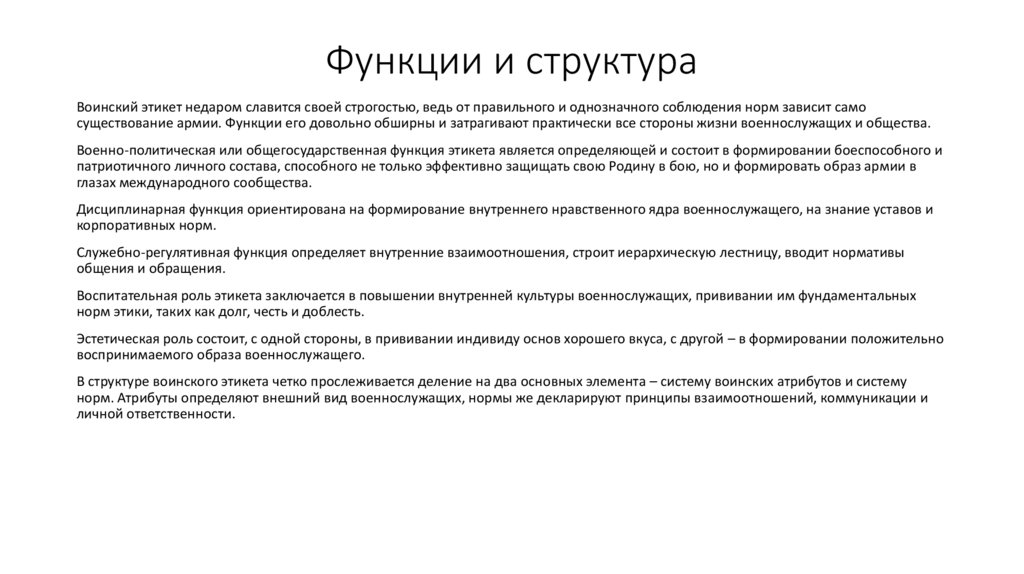Функции и структураВоинский этикет недаром славится своей строгостью, ведь от правильного и однозначного соблюдения норм зависит само