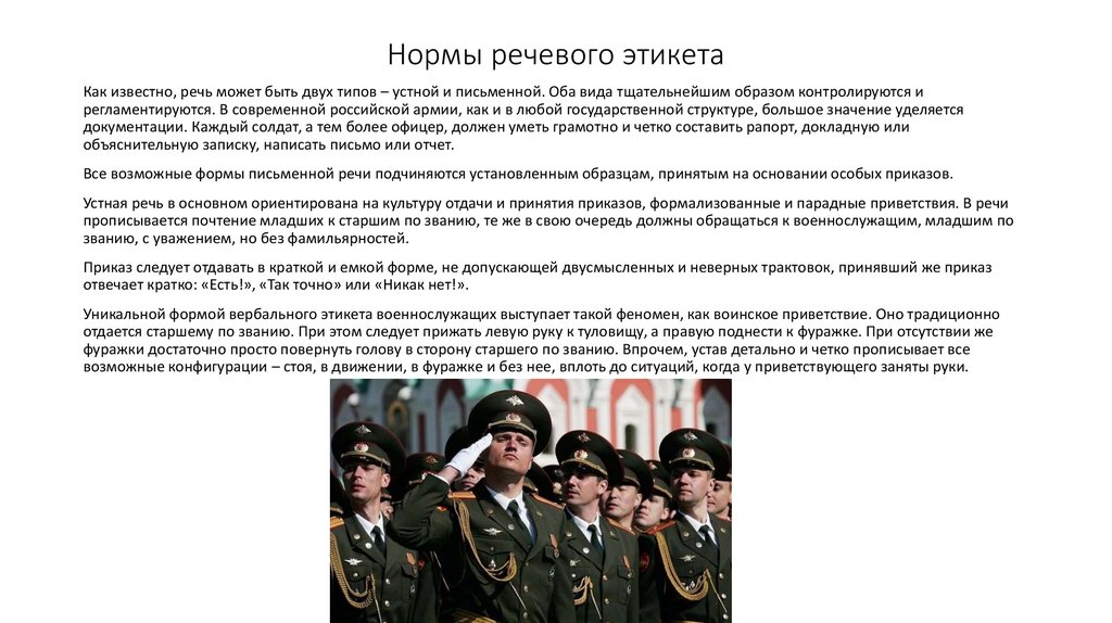 Уникальной формой вербального этикета военнослужащих выступает такой феномен, как воинское приветствие. Оно традиционно