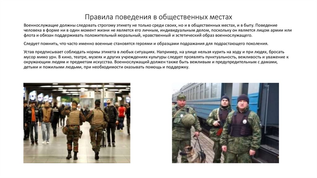 Правила поведения в общественных местахВоеннослужащие должны следовать строгому этикету не только среди своих, но и в общественных местах, и в быту. Поведение